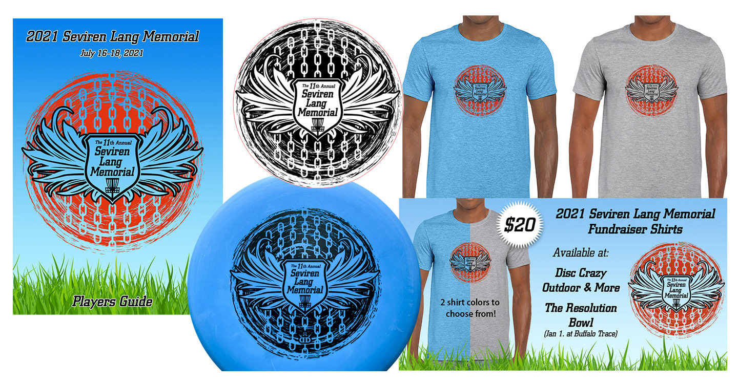 Examples of the yearly tournament branding on posters, clothing, frisbees, glass ware, and trophies.